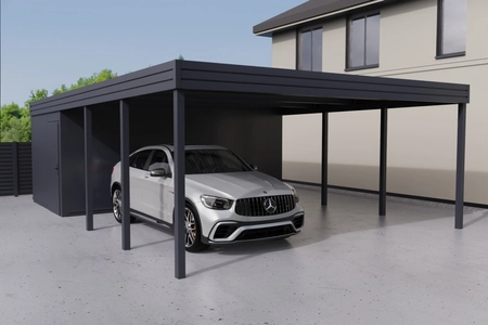 - Carport mit Abstellraum besteht aus feuerverzinktem und pulverbeschichtetem Stahl. Er vereint einen überdachten Parkplatz mit einem geschlossenen Lagerraum.