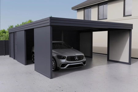 - Die Carport-Konstruktion mit rückseitigem Schuppen ist aus feuerverzinkten und pulverbeschichteten Stahlprofilen gefertigt. Der offene Bereich dient als Fahrzeugstellplatz, während der geschlossene Raum als Abstellmöglichkeit für Werkzeuge genutzt wird.