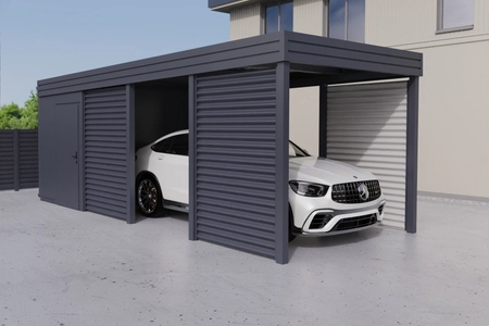 - Carport mit integriertem Abstellraum, der Stellplatz und sicheren, abschließbaren Stauraum für Werkzeuge oder Geräte kombiniert. Die pulverbeschichtete Stahlkonstruktion ist korrosionsbeständig und wartungsfrei.
