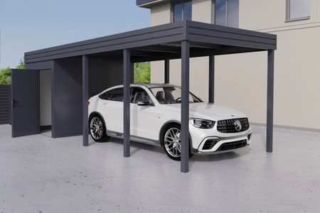 - Der Carport mit Abstellraum ist eine Konstruktion aus feuerverzinktem und pulverbeschichtetem Stahl. Er vereint einen überdachten PKW-Stellplatz mit einem abgeschlossenen Geräteraum.