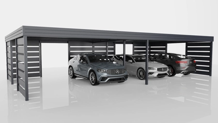 - Der Reihen-Carport aus feuerverzinktem und pulverbeschichtetem Stahl garantiert langlebigen Schutz und hohe Zuverlässigkeit. Dank der robusten Materialwahl ist kaum Wartung nötig, und die Konstruktion hält Witterungseinflüssen langfristig stand.